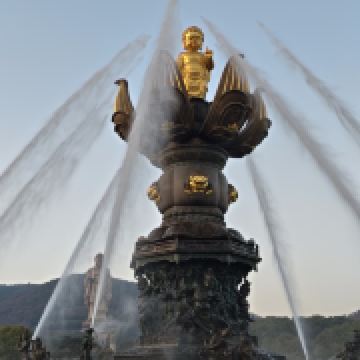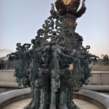 更难得的是,灵山胜境的大型音乐动态群雕“九龙灌浴,花开见佛”再现了故事中的绚丽景象。在九龙灌浴广场,我们可以看到一座含苞待放的巨大莲花铜雕矗立在前方,巨大的荷花由四个威武的大力士托起,底部衬托着白色的圆形大理石水池,九条飞龙和八个形态各异的供养人环绕着巨大的水池。