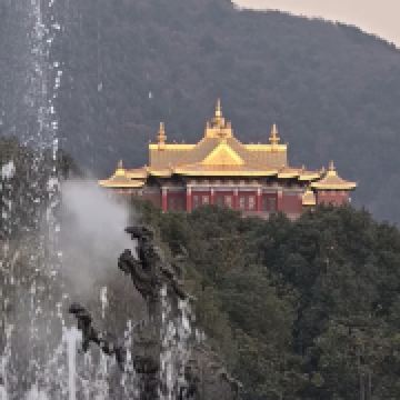 3、再向南到“九龙灌浴”广场,这是整个景区的正中心,也是《九龙灌浴》节目的表演,周中每天3场周末4场,我看的是10:00那场,水坛正中最高处的莲花会慢慢散开,露出金色的释迦牟尼幼年像,水潭边缘青铜座龙仰视佛祖,制作精细花纹唯美,随着喷泉涌出,佛祖旋转360度后莲花瓣缓缓合闭。节目时长10分左右,特别提醒当天如果刮风,别在下风口观赏,否则会像我一样被刮来喷泉淋成落汤鸡。
