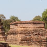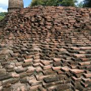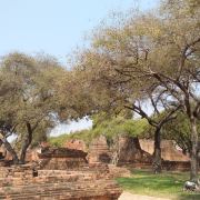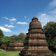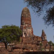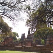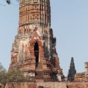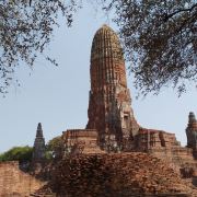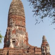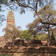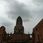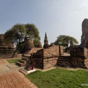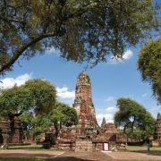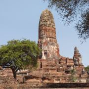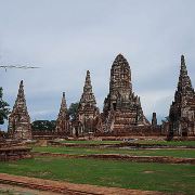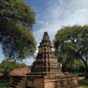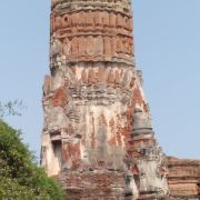 这是一处建于初代国王火葬遗址上的寺庙,规模庞大,在众多遗迹中值得一览。据编年史记载,1369年大城的二代王拉梅萱为他的父亲初代王选择的火葬地。现在游客见到的这座形如玉米的优美高棉式佛塔是后来包若玛特罗卡纳国王在15世纪对寺庙进行改造时建造的。