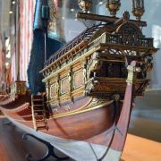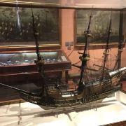 馆内值得一看的藏品当属安放在陈列厅中间的战舰“奥地利的约翰”号,它曾在勒班陀战役中立下战功,精雕细刻的镏金船头饰件,鲜红的船身,两侧密密麻麻的巨桨,弹眼落睛。不过不能上船参观,略为可惜。