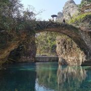 凝碧潭,位于果盒岩与渡船岩之间,宽阔亩余,深10米,潭水澄碧,清澈见底。果盒桥,横跨凝碧潭上,紧靠果盒岩,果盒岩生得蹊跷,形状扁圆平整,中间有一条环痕,俨似果盒。