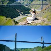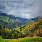果子沟大桥位于新疆伊犁州霍城县,全长700米,桥面距谷底净高200米,主塔高度分别为209米和215.5米,景观价值体现在其宏伟建筑结构和所在的自然环境。