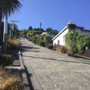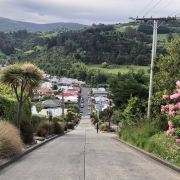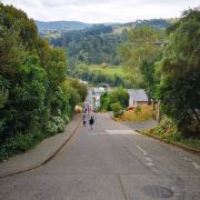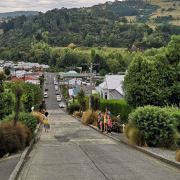 但尼丁的鲍德温大街,坡度为35%,是世界上较陡峭的有人居住的街道。走在这条长度约350米的街道上,平均每走2.86米,高度就提升1米,“爬”到路的尽头,感觉犹如在登山。