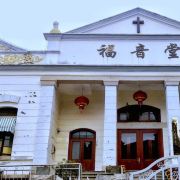 鼓浪屿福音堂建于1901年到1903年,由伦敦会系统的泰山堂和关隘内堂两座教堂的华人信徒捐资兴建,位于日光岩山麓,可容纳一千人左右。
