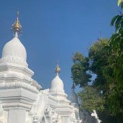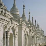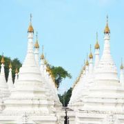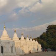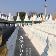 5分 超棒寺庙位于曼德勒山脚东南边,建于1866年,是敏东王为了纪念被杀害的弟弟所建。沿着大门,穿过长廊,就可以到达正中间的金色的大佛塔(里面存有敏东王弟弟加襄王的骨灰),正中还供奉一座金色佛像,据称是迁都时,敏东王从阿玛拉普拉古城迎过来的。旁边还有一座小金塔。围绕着大的金塔,以此往四个方向呈正方形延伸,布满了密密麻麻的白塔758座,形成一个白色方阵。每个塔顶都有金色的铃铛,微风拂过,声声铃铛响,仿佛是敏东王在向自己的弟弟诉说哀思。