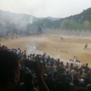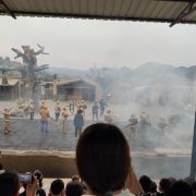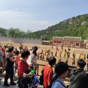 最震撼的是马术表演,模拟了一场古代大战,声势浩大,表演人员马术精良,时而边跑马边侧身翻腾,或者直接下马,倒挂在马腿边,一会敌我战将马上酣斗,真的很精彩,一定不要错过。整个场面跟电视剧中战场镜头很像,但更真实,仿佛回到历史大战中。不过表演时间比较固定,一定要提前安排好行程,以免错过。为了抢得有力位置,我们是提前半小时就进去等了。但不要坐在第一、二排,因为一会就有很多人站在前面的过道上,把一二排的观众挡的严严实实。