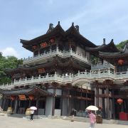 元符万宁宫位于句容市东南20公里处的茅山上,是景区内主要的道观之一,与位于茅山高峰大茅峰上的九霄万福宫合称“茅山道院”。元符万宁宫建成于宋徽宗崇宁五年(公元1106年),又名印宫,得名于宋代皇帝赠送道观的珍宝“九老仙都君印”,有“印宫一颗印”之说。现在的元符万宁宫多数殿堂、雕塑为现代新建,引人注目的的要属净高33米的金色老子神像,在很远的地方就能看到。茅山因地处句容市和金坛市的交界处,西边归句容管,东边归金坛管,元符万宁宫属于句容茅山。在句容茅山主入口(茅山西门)可坐观光车,站点涵盖景区各个主要景点,运行路线是先去九霄万福宫,再去元符万宁宫。由大门步行到达元符万宁宫的话,约要走2公里。注意如果是从金坛金牛岭索道处(茅山东门)上来的,徒步需在山脚支付登山费,索道的话就不用付了。步道与索道的终点都是山顶的九霄万福宫,也归句容,此时要再次购买句容茅山的门票,才能去山下的元符万宁宫。金坛山脚是没有句容茅山门票出售的,必须到山顶后购买。从金坛全程徒步翻山到元符万宁宫,走得快也要2小时。元符万宁宫主体建筑南北走向,分四层,第一层在南端,之后一层比一层高,层与层之间有露天台阶相连。第一层东侧是道观大门牌坊,中央是睹星门,北侧是门上写着“敕赐元符万宁宫”的灵官殿。睹星门左右石壁的背面写着“第八洞天、第一福地”,一定要摸一摸那个“福”字,据说能带来好运。第二层中央的万寿台上是三天门石坊,坊上石雕精美,多数构件为明清两代古物,道观在历代战火中能够幸存下来的建筑不多,这是其中一座。三天门旁边的勉斋道院也是幸存下来的建筑,你可以找一找它的神秘符图,门额上有坎卦符号,门前地面用青砖与小瓦拼出了类似于一个花盆中伸出三根长矛的图案,据说勉斋道院能幸存下来和这些道教秘术有关。第三层为太极广场,中央是“太极池”,地面上有很大的太极图案,代表阴阳两极的位置立着黑白两颗石球。广场东南边和西南边有钟亭和鼓亭,东北边和西北边有太元殿和三官殿,主殿太元殿内奉三茅真君香樟木雕像。西行100米,是慈航殿,供奉吕祖、关公、药王等道教神仙。沿中间写有“道法自然”四个大字的石阶攀登来到老子神像的楼下,然后沿两侧石阶继续攀登即来到第四层——老子神像所在的老君广场。抬头仰望八角形神台上铜制的老子神像,确实气势非凡,仔细看老子抬起的那只手,手心下有一个直径1米货真价实的马蜂窝,非常神奇。老子神像后方是贴着山壁而建的东西文化长廊,可以观摩和道教有关的彩绘、石刻、壁画、板雕。元符万宁宫外有餐馆,一般游客玩茅山,想在景区内吃饭,都是在这里解决的。另外,离道观不远的华阳洞是南朝陶弘景修炼的地方,可以步行过去一观。“九老仙都君印”虽然出自元符万宁宫,但是现在想盖一枚这样的印章要去九霄万福宫,而且普通游客比较难请到,要旅游团电话联系了景区后,和九霄万福宫说好,去时才能请到。