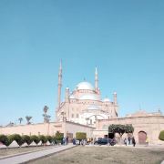 穆罕默德·阿里清真寺建于1830年,位于开罗旧城萨拉丁城堡内。其特点就是典型的土耳其风格,同时也采用了土耳其与埃及风格并置的手法,且建筑整体有四个半圆殿与正殿相应,还有四根高柱居其中。对角线上有两座细长的光塔,像两支伸向天空的火炬直插云霄,塔顶距地面85米,宽广的圆顶覆上了一层锡,使得它在阳光下显得醒目耀眼。远看整幢建筑给人以素净的美感。