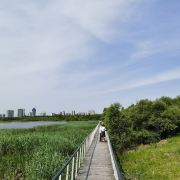 木质栈道蜿蜒穿过湿地,在夕阳下投下长长的影子。三三两两的游人漫步其间,或驻足拍照,或静静凝视远方。远处的城市轮廓渐渐模糊,高楼化作剪影,与自然交融成一片宁静的画卷。