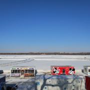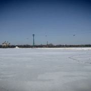 复刻了第九届亚冬会点火精彩瞬间(摩天轮和火炬塔相交照片),传递亚冬会精神,激发游客对冰雪运动的热爱。这个区域有冰面可以玩耍,透过飘雪机的雪幕后是太阳岛经典的雪人先生造型,在这个位置游客可以戏雪。