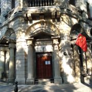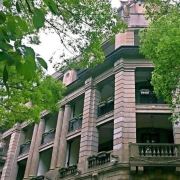 • 建筑平面呈南北向长方形,东南部与西南部作削角处理,作为入口。首层的出入口采用西方灰白色花岗石古典山花门,山花门上方勾出放射状饰线。为了左右对称,有3个窗也做成山花门状。