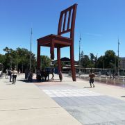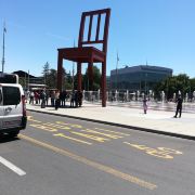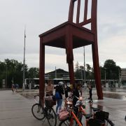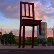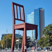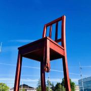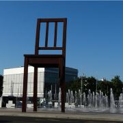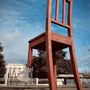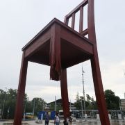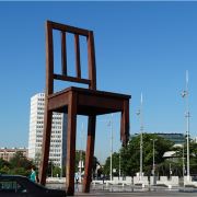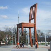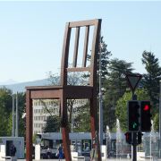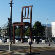 断腿木椅位于万国宫前的广场上,是日内瓦艺术家丹尼尔·伯塞特的雕塑作品,为1997年国际残联呼吁人们关注战争中地雷对平民造成的伤害而建立。这个12米高、5吨重的雕塑虽然只是到此一游的“景点”,却有着特殊的意义。雕塑周围并没有任何文字说明,但残缺的椅腿无疑象征着人类因地雷爆炸而失去的肢体,给人们留下了关于战争与和平的思索。