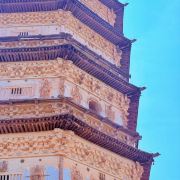 万部华严经塔因塔身通体洁白又称白塔,位于呼和浩特市东郊18公里的白塔村,据传为辽圣宗时所建。该塔为楼阁式砖木结构,高约45米,雄伟壮观,塔内有旋转式楼梯,还有多层交错搭接的木梁,攀至塔顶可远眺山川景色。