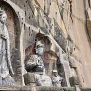 潼南大佛寺位于潼南县城西北1.5公里的定明山下,今存有大佛阁、观音殿、玉皇殿、鉴亭四座木结构古建筑。大佛阁依山傍水而建,为七檐歇山式建筑,景象壮观。阁内凿崖而就的释迦牟尼佛坐像,高18.43米,神态庄严。这尊大佛俗称“八丈金仙”,以大佛为中心,在东西长达里许的崖壁上,留有历代骚人墨客书镌的题记、诗咏、碑碣、造像等83则。