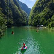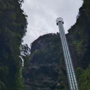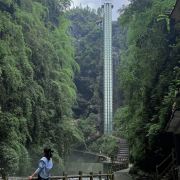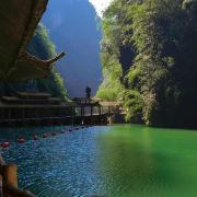 阿依河景区峡深谷高、河床狭窄,河水清幽而景色,是夏季避暑嬉水的好去处。阿依河漂流分为上、下两个半程(分别收费)。其中上半程水面平静,没有激流;下半程河道比较湍急,途中有激流险滩三处,其中第一处为惊险。从阿依河景区入口到竹板桥码头,可以乘坐百米电梯(天梯),天梯是修建在母子溪峡谷的观光电梯,整个电梯运行高度约148米,是目前亚洲高的峡谷类景区室外观光电梯。或者你可以沿着向下的台阶(号称千步梯),步行大约半个多小时到达码头。牛角寨是划分阿依河上、下段的分界线,在这里可以乘坐电瓶车直接到达景区的出口处。