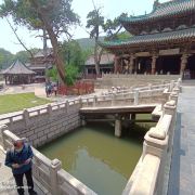2、博物馆面积不大,但人文景观密集,是历朝历代一次次扩建的,非一次性建好。径直穿过“水镜台”(迎神、演戏的舞台,《水镜台》是晋祠三大名匾之一。从背后看是戏台是老版《西游记》里孙悟空被二郎神追逐时变成的小庙,只是少了金箍棒。景区很多处都是取景点)、“会仙桥”(是文物,石制桥身由玻璃和木栈保护)、“金人台”(祭祀平台,中间一尊上香用的琉璃亭,平台四角各有1尊铁人像,3尊有900多年历史,代表了宋朝铸铁的最高水平;1尊是民国时补铸的)、“对越坊”(牌坊,牌匾《对越》是晋祠三大名匾之一)、“献殿”(用于陈列贡品,四壁通风,盛夏时殿内极其凉爽,像开了天然空调)、“鱼沼飞梁”(十字形石桥,世界第一个立交桥,桥下锦鲤游弋)后到达“圣母殿”(全祠主殿,供奉晋王母亲,始建于984年,奇迹般保存到现在,祠堂柱子上盘踞8条腾龙是国内独有,殿外两侧高大的侍卫面目狰狞。殿内的宋代彩色泥塑是艺术珍品,晋祠三绝之一,包括梅兰芳在内的艺术大师都赞叹不已。殿侧面是一排碑廊)。后三者是晋祠三大国宝建筑。