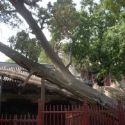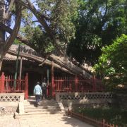 3、圣母殿北侧便是最有名的周柏(全园高龄的周柏和唐槐很多),在“苗裔殿”门前。这棵周柏是晋祠三绝之一,3000年树龄的柏树斜倒,被自己子孙树,1000岁的“撑天柏”扶住,寓意“老有所依” ,因此成为全家游必拍合照的地方,以教育子女孝敬老人。