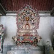 寺分三进院,前院的龙王庙、戏楼已无存。中院现存东配殿和大佛阁。阁内大佛高9米,结跏趺坐于佛坛上。大佛面目慈祥,袒胸,双肩有披饰,两手叠压,手掌朝上;身后彩绘背光。整个塑像造型庄重丰满,衣纹线条流畅,色泽明快。坛下两侧立有胁侍菩萨两尊,比例适度,为明代遗物。