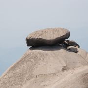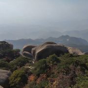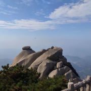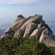飞来峰在“龙吟虎啸崖”的西端,一峰独立入云,峰顶巨石如盖,浑身石骨,浅浅的水痕遍布全身,这就是天柱山第三高峰----飞来峰。它海拔1424米,整座山峰为一整块巨石构成,顶有一石长约3丈有余,围长30余丈,高丈余,浑圆如盖压在顶峰,似从天外飞来,石称“飞来石”,峰因石名,峰顶的飞来石,像一顶华冠端端正正地戴在峰顶。飞来峰,从南面看,如帽如笠;从北面看,如棋如磨;从东看,如球如拳;从西看,则如牛眠虎卧。飞来峰的西部的石壁上,由于泉水的长期侵蚀,形成一块石鳞斑斑酷似“龙鳞”的斑块。细心的游客不难发现,那外围轮廓与我们现在安徽省地图的轮廊有着惊人的相似呢。在飞来峰南面的是“宝月峰”。峰顶东西有两个触角状的巧石,中间平坦一块方桌状的石板,两块巧石像两位老者各自向后微微倾斜,好一幅悠闲自得的神态----“二仙对弈”;从东向西望,似一弯新月挂在蓝天----“宝月”;而从东南方向西北观望又变成了“金鸡唱晚”,真可谓移步换景,妙趣横生。东边,天蛙峰、丹砂峰、飞虎峰、佛子峰、迎真峰、石纽峰、麟角峰、覆盆峰、天狮峰等,群峰起伏,清秀挺拔。
