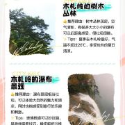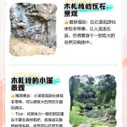 木札岭整个区域分为九撞沟、原始森林、官帽峰三大游览区,其中官帽天成、天河飞瀑、古木幽林、灵石妙趣、流泉映翠、云海仙镜、松桦月影、木楼逸情合称“木札岭八景”。景区面积较大,游客可以用两天的时间来游玩木扎岭(第二天进入景区无需重复购票),景区周边有不少农家乐和宾馆可以住宿。