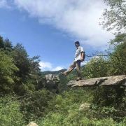 庐山天桥位于锦绣谷内,相传朱元璋与陈友谅大战于鄱阳湖,后朱元璋兵败被逼逃上庐山,带着所剩无几的残兵败将慌不择路逃到了悬崖边,下临深谷,前无去路,后有追兵,正在这危急之时,突然天降金龙化作虹桥,朱兵马刚刚过桥脱险,刹时晴天霹雳巨响,龙飞桥断,就此留下天桥奇观。后来朱元璋做了皇帝,这一美好传说流传至今。后人就势修筑一凌空巨石于深涧上游底部,游人或蹲或立于巨石前端,以远处悬崖作背景,利用视差可以拍得一张感觉惊险的“天桥留影”。