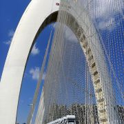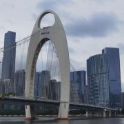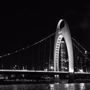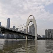 广州的珠江上横跨着多座大桥,猎德大桥就是其中之一。大桥单塔自锚的结构让它远远望去好像一座半圆形山峰,悬索坚强有力地将它固定住。人们可以在两侧的人行道上自由观赏珠江美景,大桥的夜景更是迷人,彩色的灯光、江风、来往的车和轮船都是一种别样的景致。