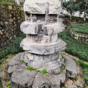 5分 超棒梵天寺经幢,八边形,由基座、幢身、华盖、腰檐、山花蕉叶、宝珠、仰莲、方柱、覆莲等构件层层迭建。幢顶为日月宝珠,雕刻精致,纹饰各异。基座为须弥座,共三层,底层浮雕“九山八海”;束腰浮雕蟠龙,生动威武;上层短柱四周凿成小龛,龛内雕佛像。幢身刻佛经,左幢刻《大佛顶陀罗尼经》,右幢刻《大随求即得大自在陀罗尼经》,两幢身均刻有建幢记,文字相同。经文为正书,建幢记行书,文末署“乾德三年乙丑岁六月庚子朔十五日甲寅日立,天下大元帅吴越国王钱俶建”。幢身之上为华盖,上端饰如意云纹,下部雕伽陵宾伽,似有云际飞出之感;腰檐仿照木构檐子雕造,用斗拱挑出,承托檐子。斗拱每面铺间一朵,六铺作双杪单下昂偷心造,檐子雕出瓦、椽、脊、戗兽、滴水瓦当等。经幢每层短柱上刻设佛龛,龛内雕造佛和菩萨像,有一尊、三尊或七尊,形象端庄,比例匀称,各像之间配置得当。梵天寺经幢,统体由太湖石构筑,体量高大雄伟,挺立于山坡之上,历经风霜岁月,是吴越建筑可贵的实物遗存。