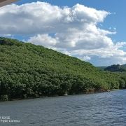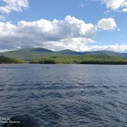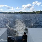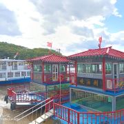 2、游船启航,前半段主要是看60多座房子,即各名人在镜泊湖住过的别墅宾馆,以及大企业(三行+一局。只有高层才有资格来此)在镜泊湖修建的疗养院,印象较深的是侵华战争时日本在水边修的发电厂,丰水季水位几乎淹没了发电厂的排水口。中半段是两侧各种象形山(例如像桃子、像骆驼、像仙翁等等,有的比较牵强)。2014年前镜泊湖游船只走半湖,待船40分钟+往返各40分钟,共2个小时只能看看房子,当地人戏称“半湖看房子”,后经国家批示可以游全湖了;后半段有斯大林二儿子避难住所(来住过两年,还特地为其通电,他的回忆录里难以忘怀在镜泊湖这两年的平静时光)、渔场(镜泊湖因其特殊性,只能国家统筹捕捞,私人不能捕)、湖心岛(岛上有刘少奇夫妇栽的两棵迄今仍相同高的树,寓意比翼双飞)等。