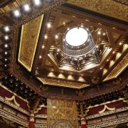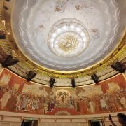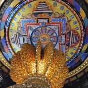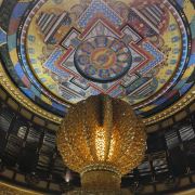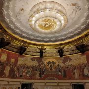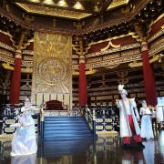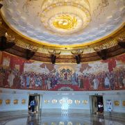 ②二层:接引室,室外石阶会直接通到这一层,南侧石阶铺满假花尤为漂亮。宽阔的大厅顶上绘有一只直径3米的金凤凰,四周墙壁是22米长的壁画《万国来朝》,由中央美院的壁画大师王颖生、孙景波等教授创作,场面大气庄严、雍容华贵