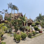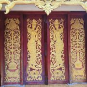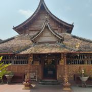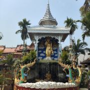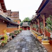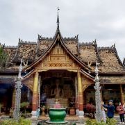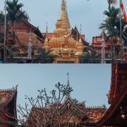 3、景区内很多寺庙 ,是村民自己建的,各有其风格和特色,规模最大最奢华的是景区中央的“勐罕春满大佛寺”,始建于583年,据说是佛教传入西双版纳后的第一家佛寺,堪比上午曼听公园里的总寺庙,富丽堂皇庄严无比,三只白象驮着的四面佛造型优雅精美。进主殿要脱鞋,寺内藏有两千多年历史的贝叶经(书写在最大的棕榈树树种之一的贝叶棕叶子上的经文),附近的民居小店里有介绍其制作过程。该寺院是村庄里人文景观颜值最高处,其余小佛寺有“勐罕曼将大佛寺”、“曼乍佛寺”(旁边的寨子叫“曼乍寨”)、“曼听佛寺”(在“曼听村”旁、景区最东边,门口有塔顶着树、树包着塔的“塔包树”。寺庙普通,但寺后院有僧人住的悬空木屋,还堆放着一艘龙舟,更原始更真实)。
