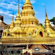 寺外五座金塔在阳光下闪闪发光,塔尖还挂着风铃,微风吹过发出叮当声,既增添了一份神圣,也让空气中的宁静有了节奏 。