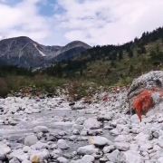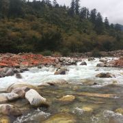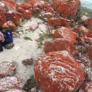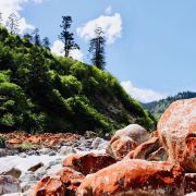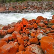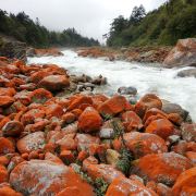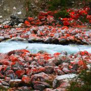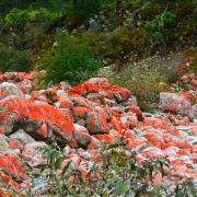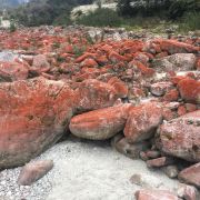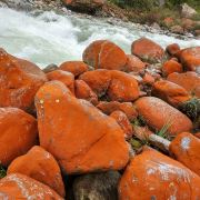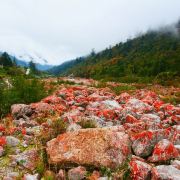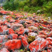 海螺沟红石滩位于四川省海螺沟景区雅家埂两河口地带。有“世界的红石公园”之称。由于海螺沟独特的潮湿滋润气候、为橘色藻提供了充足的营养的锰等矿物元素等独特的地理气候原因,这里的石头上布满的红色物质。这一物质是一种微生物,在高山特有的生态环境内得以繁衍,形成奇特的景观。据中科院的研究,石头上的红色物质一种气生丝状绿藻---乔利橘色藻,鲜艳的血红色是因为细胞内富含虾青素。
