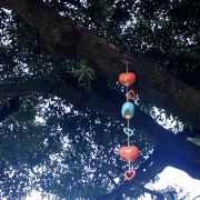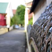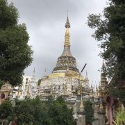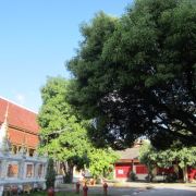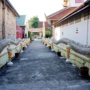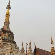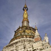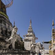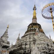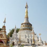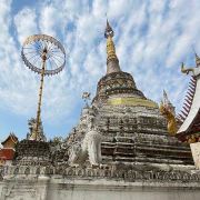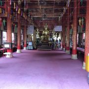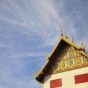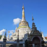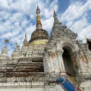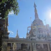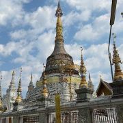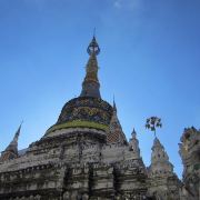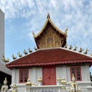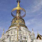 寺内的白色高塔装饰非常华丽,塔尖金色的阳伞、小铃铛及周围同样戴着金色小阳伞的小塔,好像在阳光下跳舞高歌, 热闹非凡。僧院与大殿屋顶皆是新修的红绿瓦顶,鲜艳的色彩反衬出格外平静的午后寺庙。