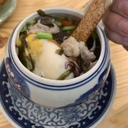 ✅韩国炸鸡小份,当天没有笑脸薯饼,是普通的薯格,蘸酱口味任选。鸡翅是微甜的口感。韩国泡菜拌饭:经典的温泉蛋搭配烤肠、海苔,拍好趁热赶紧拌匀入口,大冬天的超满足。