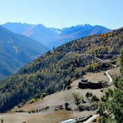 俄初山像一位美貌仙子端坐云霓,南部为高山峡谷区,北部为俄初峡谷,撑托着地势较缓的美丽小山村,俄初山周围植被茂盛,其中拉姆格林区是稻城较大的林区。