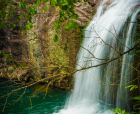 ③跌水腾龙瀑:五福玻璃桥下的景区最大瀑布,高130多米,瀑底是250万年前的火山口,因在天气骤变时瀑底水汽弥漫犹如神龙腾空而得名