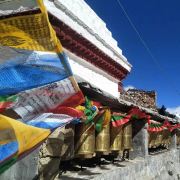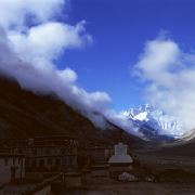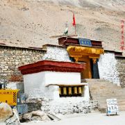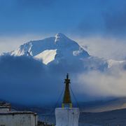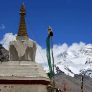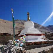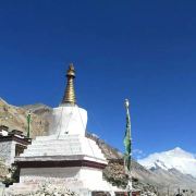 珠峰大本营绒布寺,全称“拉堆查绒布冬阿曲林寺“,位于珠峰脚下绒布冰川的末端,海拔5150米,属藏传佛教宁玛派寺庙,是少见的僧尼混居的寺庙。 整个寺庙依山而建,共有5层,现在仍在使用的只有两层。寺庙分新旧两处,旧寺靠近珠峰,寺内存有莲花生大士当年静修的修行洞,以及印有莲花生大士手足印的石头和佛塔。新寺建成于1902年,下设一个尼姑庵。从寺内向南,是观赏珠峰的好位置,尤其是寺门口的玛尼堆和白塔,常被游客作为拍摄珠峰的前景。