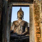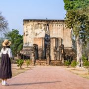 西春寺,位于古城外,具有南传佛教的风格,是素可泰寺庙中较为神秘的一座寺庙。在寺庙的入口处,可以看到复原的建筑图。寺庙的较大的看点,是寺中巨大的坐佛像,高约15米,佛像的手指镀金,手指线条优雅流畅。坐佛在阳光的照耀下,徐徐生辉。如果你时间充裕,可以在佛像边坐一会,感受这里的历史厚重和时光的流逝。