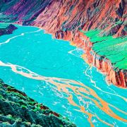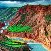 大峡谷拥有红山、黛崖、青峰、绿岛、碧水等景观,一年四季有着不同的景色,就像一条彩带飞舞在天山北坡脚下,成为中国峡谷群中色彩较为丰富的大峡谷,也被誉为“中国科罗拉多大峡谷”。这里两岸地貌各异,西岸是戈壁,较平坦,东岸则是绵延起伏的山峦,形成鲜明的对比,给人一种别致的感觉。