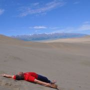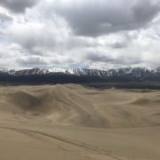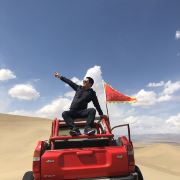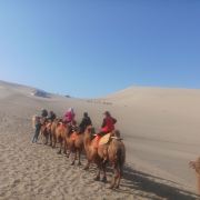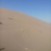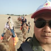 5分 超棒从敦煌我们坐旅游巴司过去。台头望去一片沙山,可自己爬上去,沙山不算太高。也可骑骆驼上去,一百多元吧,不到山顶,最后一段还是要自己爬,或者坐小滑车,蛮贵的。沙山很难爬,真可畏走一步,退半步,要不是有绳梯增加磨擦力,是很难爬上去的。我们很坚难的爬到山项,很自豪。