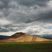 在辽阔的草原上,奇妙地出现了一座长约五公里,以石英长石堆积而成的沙山,山呈东北-西南走向,西缓东陡。脚下有条小河蜿蜓流过。当人们从沙山顶往下滑时能听到从山的内部发出的声音,犹如万马奔腾,海潮汹涌,故名鸣沙山。
