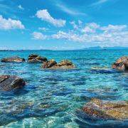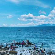 会有垃圾。海边的左方有一些礁石,可以坐在上面看