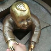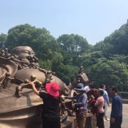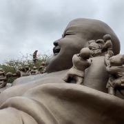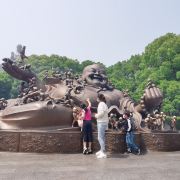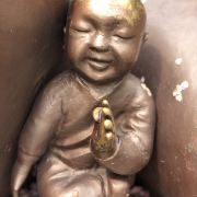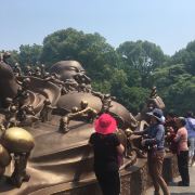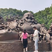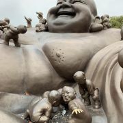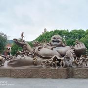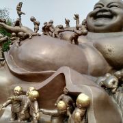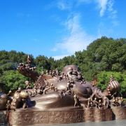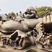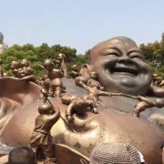 大型青铜艺术珍品 “百子戏弥勒”位于无锡灵山大佛下阿育王柱广场右侧,弥勒佛高3米,宽7.8米,重9吨。喜庆吉祥,深受游客喜爱。斜倚而卧的弥勒神情和蔼,笑容可掬。在弥勒硕大的身体上,塑有整整一百个正在嬉戏耍闹的小顽童,各个形神各异,栩栩如生。他们有的在叠罗汉、有的杂耍、有的拔河、有的掏耳、有的滚打、有的在拿小树枝捅弥勒的肚脐、更有调皮的竟然在弥勒身上撒尿。百童散布弥勒周身,令人忍俊不禁。一百个嬉戏玩耍的孩童攀爬在笑眯眯的弥勒背上,给肃穆的灵山平添了几分活泼。