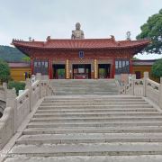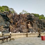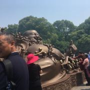 2、“祥符禅寺”位于半山腰,呈方形,主殿是“大雄宝殿”,主殿主对着院中心缩小版的灵山大佛,远近两尊相同模样的佛像可同框,颇有韵味。院四周还有“法堂”(生活区,内有盆景陈列、会客厅和历代主持牌位堂)、“尊宿阁”、“卧佛殿”、“黄陵柏”、“伽蓝殿”、“钟楼”(不开放)和“鼓楼”,另有银杏树和石榴树硕果累累。向南出寺院,跨过放生池(池内很多乌龟)上方的“普渡桥”(五座石桥各有其名字,普渡桥在最中间)后到达“佛手广场”,西侧是“天下第一佛掌”铜雕,以1:1比例复制了灵山大佛的手掌,高11.7米,是极具特色的标志性景观;东侧是“百子戏弥勒”铜雕,名气也很大,侧卧的弥勒佛全身上下都很多小和尚,体现弥勒包容一切的海量。