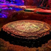 莲塘奇观,水面飘浮着大大小小108块如荷叶的云盆,盆中满盛天然穴珠,又称溶洞珍珠,大小、形状、颜色与莲实同。仙莲倒挂,进口处簇簇乳石,如片片莲瓣,橡一朵硕大的莲花,高悬洞顶,华丽夺目。堪称世界顶级奇观。