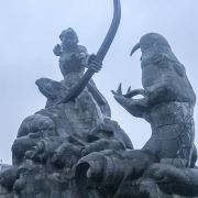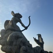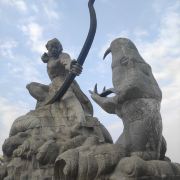 巴陵广场位于美丽的洞庭湖畔,附近就是岳阳美食街汴河街和岳阳楼公园,是岳阳热闹的场所。这个面积4万多平方米的广场明显的标志就是那座高达16米的后羿射巴蛇雕像,取自山海经巴蛇食象的故事,相传后羿曾斩巴蛇于洞庭湖,积骨成丘陵乃有岳阳,用神话传说诠释了岳阳这座城市“巴陵”称呼的来源,也体现着“羿射巴蛇,万民乃安”的意思。整个广场气势恢宏,中央广场周边为疏林草地,广场基本对称,突出东西向的城市历史发展轴,站在滨湖景观区的台阶上可欣赏到洞庭湖的美景。平台直通水面,大气壮观。沿湖用岩石连城围栏,上面刻写着许多文人墨客留下的诗句,耐人寻味。广场边还有瞻岳门、博物馆等城楼,可将广场、洞庭湖的景色一览无余。
