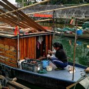 5分 超棒水上人家我是看过很多很多,走上去也好多好多,文莱,菲律宾,泰国,沙巴。。。数不过来了,但是,中国的水上人家我还从来没有见识过,最多可以远观一下,今天,我亲身在河源的新丰江上,细细走遍了这个水上人家,主人非常友善,允许我慢慢在他家里晃悠拍照。人家是几条长板搭起来的,通到岸边,然后围着这些板的两边,排列了很多大大小小的船,构成了主人家的卧室厨房,工具房,还有随时可以出动的大小渔船,等等等等,而且居然有厕所,还有条长的跟浣熊一样的狗,厕所当然还是排到江中,但比旱厕要高级多了。