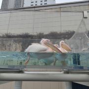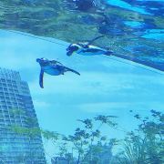 △ “天空企鹅”是一个宽度约12m的宽敞的大型悬垂式水槽。您的眼前将呈现出非洲企鹅在都市高楼的上空欢游嬉戏的场景,抬起头仰望天空,您还可以看到在头顶穿梭的非洲企鹅的身影。