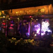3、酒吧街是仅次于“四方街”的最美夜景拍照带,玉河沿岸酒吧灯火通明、座无虚席,不同酒吧不同的装修风格让人耳目一新,让自己与小桥流水人家融为一体;不同曲调歌声混杂震耳欲聋,包含抒情、摇滚、粤语等各种风格曲目,但几乎没有静吧而都是闹吧,酒吧门口的木板石桥虽简陋但也古色古香颇有一番神韵。石板人行道比较窄,人声鼎沸、摩肩接踵,很多美女身着民族服饰在拍写真,也是一道靓丽的风景线。北侧入口的白色碑墙上刻有江泽民1999年题写的“世界文化遗产-丽江古城”,斜对面的图腾红墙也很有少数民族特色。