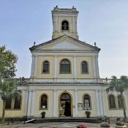 教堂的设计简洁而典雅,外墙为米黄色,顶部有一个钟楼,内部光线充足,营造出宁静而神圣的氛围。现在的嘉模圣母教堂也是当地居民举行婚礼和外地郊游观光的好去处。